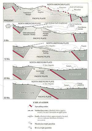 When the subduction zone ceased about 55 million years ago, the Farallon Plate was split into two distinctive plates which can still be observed today as the Juan de Fuca Plate and the Cocos Plate. Both were part of the same plate, but were discovered independently before this connection was made. At the time of this break off, the Pacific Plate had a general north west movement while the North American Plate had a general south east movement. This created a new fault zone when a weak point gave way between these two plates. This is the beginnings of the infamous San Andreas Fault. The San Andreas Fault is a right-lateral strike strip transverse fault. When this fault was just created, a volcano from the ancient subduction zone was situated about 3/4th on the Pacific Plate and 1/4th on the North American plate somewhere in what is today Central California. Nearly 55 million years later, this volcano was offset by about 250 miles. It is the largest known offset of the San Andreas Fault and it help geologist determine important information such as average slip movement and the age of the fault. The northern part of this offset is now called Pinnacles National Park near Soledad, California. The other half of Pinnacles is located in Three Points, California which is in Los Angeles County.