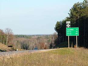 In 1947 or early 1948, the Michigan State Highway Department (MSHD) closed the gap between the northern and southern segments of M-65 by adding two "earth" roadways: one between Glennie and M-72 near Curran and a second between Curran and the Alcona–Alpena county line.[20][21] By the next year, the northern end of the highway near Posen was moved to eliminate several zig-zagging segments of roadway from the routing; M-65 ran due north to terminate at US 23 after the change.[21][22] In the middle of 1953, the section of M-65/M-72 in Alcona County was straightened and paved.[23][24] The MSHD realigned M-65 from a series of zig-zagging roads to a single set of curves along the Alcona–Alpena county line in late 1961. At the time this project was completed, all of M-65 was paved.[25][26]