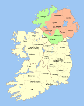 In any of these translations, though, the surname McNulty connotes that its bearer is descended from the Ulaid, a nation of people, that is the ancient Irish Uluti tribe, which dynasties in remote times ruled the entirety of the North of Ireland.[42] The "Ulaid", "Ulaidh" or "Ultaigh" (anglcized or corrupted "Nulty") are actually equated in English translation to "Ulsterites or an Ulsterite" and their former territory of the "Ulaidh (province)" is equated in English translation to "Ulster",[43] because the Ulaid in remote times so occupied roughly the land of the 9 modern counties, which are Antrim, Armagh, Down, Fermanagh, Coleraine (now Londonderry), Tyrone, Cavan, Donegal and Monaghan, of historic Ulster province in the Republic of Ireland and Northern Ireland.[44][45] The English word Ulster, itself, is the Irish word Ulaid anglicized with the English possessive ending -s and Irish tír (Ulaidh's tír) to designate the "land" or "territory" of the Ulaid, in other words, the Irish Ulaidh (province).[46][47] In addition to being fierce land warriors, the Ulaid were also known for a formidable seafaring navy.[48][49][50]