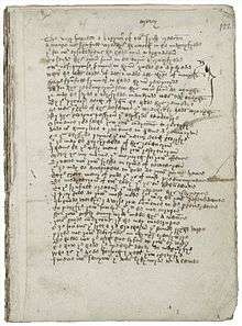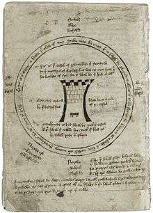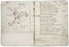 References in The Castle of Perseverance to "crakows" (an early 15th-century shoe fashion with pointed toes) indicate that the play was written between 1400 and 1425, making it the earliest complete extant English morality play.[7] The Macro manuscript's Castle was transcribed around 1440.[8] Despite being chronologically first, the play is bound third in the Macro manuscript, in folios 154-191. The play has 38 extant leaves, with two gatherings of 16 leaves and a third gathering of six leaves, with nearly 3,700 lines in total. Evidence of two missing leaves suggests that there are around 100 lines that have been lost.[9] Stylistic differences in dialect, rhyme scheme and stanza pattern between the banns (an advertisement for the coming performance that begins the play) and certain sections of the play text lead to the argument that the play may have had two or three authors.[10][11][9]