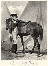 On September 11, 1777, Wayne commanded the Pennsylvania Line at Brandywine, where Wayne held off General Wilhelm von Knyphausen to protect the American right flank. The two forces fought for three hours until the American line withdrew, and Wayne was ordered to retreat.[4] Later, Wayne was ordered to harass the British rear in order to slow General Howe's advance towards Pennsylvania. Wayne's camp was attacked on the night of September 20–21, in the Battle of Paoli. General Charles Grey ordered his men to remove their flints and attack with bayonets in order to keep their assault secret.[5] The attack earned General Grey the nickname "No Flint," but the Americans used the tactics and casualties as propaganda regarding British brutality. General Wayne's own reputation was tarnished by the American losses, and he demanded a formal inquiry in order to clear his name.