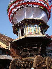 Shivaratri festival, observance of the union of Lord Shiva and Goddess Parvati is celebrated in the temple town in February, when a very large number of pilgrims visit the shrine. During this festival, Rathyatra (Rath is a large wooden chariot) is also held when images of Shiva and other deities are installed in the chariot and it is then ceremonially pulled through the town by devotees, accompanied by the drum bands. The Rathayatra starts from the Shri Maha Ganapati Temple at the terminus of the main market street, also known as the 'Car Street'.[5][7][12]
