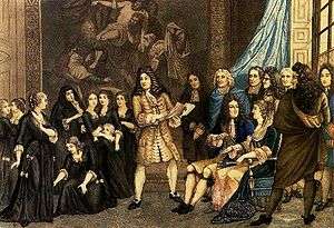 The students at Saint-Cyr first learned theatre in plays written by Madame de Brinon, then in the Conversations written for them by Madame de Maintenon on different moral subjects.[1] They then played in tragedies by Corneille and Racine. However, Madame de Maintenon was unhappy to see the Demoiselles playing scenes of amorous passion with too much ardour, and so Racine wrote the students a religious piece, Esther, which Madame de Maintenon planned put on before the king and court. This gave rise to a deep dispute between Madame de Maintenon and Madame de Brinon, with the latter opposed to a production that she suspected was only for Madame de Maintenon's own glory. This dispute was not new - since 1687, Madame de Brinon frequently reproached Madame de Maintenon for being around the establishment too much and imposing on Madame de Brinon, its superior.[2] Being its superior for life, Madame de Brinon could not be replaced, but a lettre de cachet sealed on 10 December 1688 allowed the play to be put on. Madame de Loubert, previously secretary to Madame de Maintenon and aged only 22, replaced Madame de Brinon as secretary on 19 May 1689.[5]