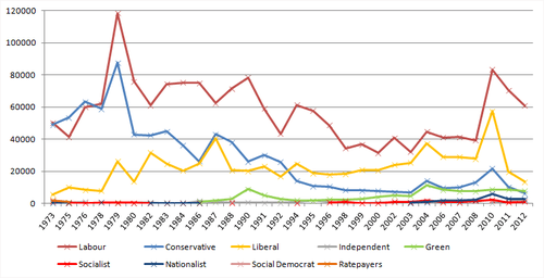 | Year | Labour | Conservative | Liberal Democrats | Greens | Independent Labour | Independent Liberal Democrat | ||||||
