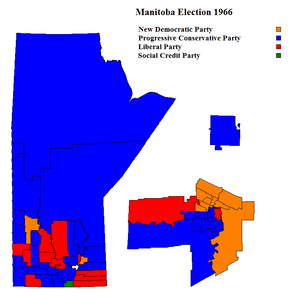 The Manitoba general election held on June 23, 1966, was held to elect Members of the Legislative Assembly of the Province of Manitoba, Canada. It resulted in a third consecutive majority win for the Progressive Conservative Party led by Dufferin Roblin. Roblin's Tories won 31 seats, against 14 for the Liberal Party, 11 for the New Democratic Party and one for Social Credit.