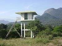 The Sarakupatti Watchtower is a small bare concrete room on an 8 m tower where one can go and wait to see animals. It has a fine view of the whole valley. It is located 1/2 km east of SH-17, 1/2 km north of Chinnar River checkpoint.[9] It is available for overnight lodging. Advance booking is required.