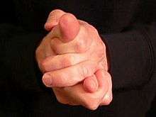 The hands are held together, trapping a pocket of air between the two palms.[2] Using the fingers of one hand, the air is squeezed out the top, between the base of the thumb and the opposite hand, to form a musical note. The pitch is determined by the force used to hold the hands together. The tighter the grip, the higher the note.[3]