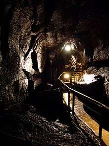 The club returned to New Chamber in 1936 to explore and survey the ongoing Skreen Hill passage, named after the hill on the surface above. After 370 metres (1,200 ft) of walking passage, the cavers stopped at a deep lake.[14] This section of deep water is where the path of the current show cave ends.[6] When club members returned again in 1938 they brought an inflatable dinghy, allowing them to progress across the lake, only to discover that the way on was blocked by Sump 1, just 40 metres (132 ft) from the shore.[15]