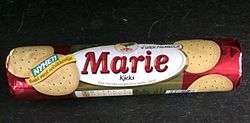 The Marie biscuit was created by the London bakery Peek Freans in 1874 to commemorate the marriage of the Grand Duchess Maria Alexandrovna of Russia to the Duke of Edinburgh.[1] It became popular throughout Europe, particularly in Spain where, following the Civil War, the biscuit became a symbol of the country's economic recovery after bakeries produced mass quantities to consume a surplus of wheat.[2]