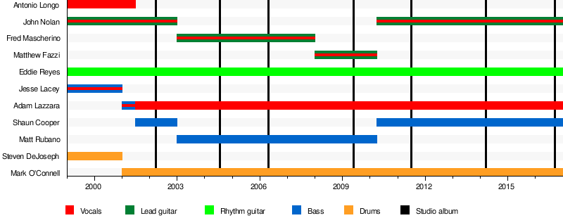 The band has released three studio albums with various past members Fred Mascherino (former lead guitarist and back-up vocalist), Matthew Rubano (former bassist), and Matthew Fazzi (former lead guitarist and back-up vocalist). The original Tell All Your Friends line-up reunited in 2010 and has released three studio albums: Taking Back Sunday, Happiness Is, and Tidal Wave.