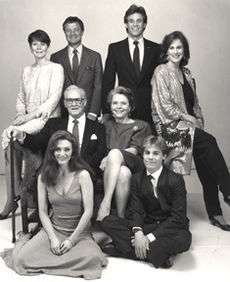 The original core family, the Hugheses, in the 1980s. Clockwise from top left: Kim Sullivan Hughes (Kathryn Hays), Bob Hughes (Don Hastings), Tom Hughes (Gregg Marx), Margo Montgomery Hughes (Hillary Bailey Smith), Andy Dixon (Scott DeFreitas), Frannie Hughes (Julianne Moore). Center: Chris Hughes (Don MacLaughlin) and Nancy Hughes (Helen Wagner).