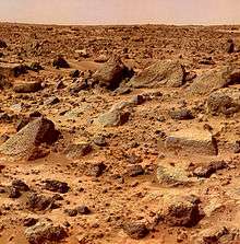 Approximately true-colour in situ images from the Mars Pathfinder and Mars Exploration Rover missions indicate that the Martian sky may also appear reddish to humans. Absorption of sunlight in the 0.4-0.6 µm range by dust particles may be the primary reason for the redness of the sky.[18] An additional contribution may come from the dominance of photon scattering by dust particles at wavelengths in the order 3 µm,[5] which is in the near-infrared range, over Rayleigh scattering by gas molecules.[19]