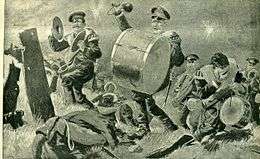 Textual evidence for the use of Scottish bagpipes in battle dates from in 1396, when records of the Battle of the North Inch of Perth reference "warpipes" being carried into battle, though it is believed that bagpipes were originally intended for peaceful music.[5] The Irish were also inspired by bagpipes, as witness in this 1586 account: "This sort of instrument is held among the Irish to be a whetstone for martial courage: for just as other soldiers are stirred by the sound of trumpets, so they are hotly stimulated to battle by the noise of this affair.[6]
