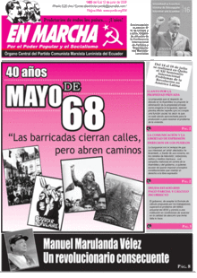 A 2008 issue of En Marcha. In the top right corner, a photo of Enver Hoxha shows the party's ideological orientation. This issue's main article is about May 1968.