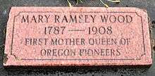 Mary Ramsey Wood aka Mary Ramsey Lemons Wood (May 20, 1787/circa 1810 (disputed) – January 1, 1908) was an American pioneer known as the "Mother Queen of Oregon". She was reported to be the oldest living person in the United States when she died, supposedly at the age of 120. It is said she traveled to the Oregon Territory across the Oregon Trail at the age of 66. There is evidence this age claim was inaccurate or exaggerated, however, and she may have been between 96 and 98 when she died.[1]