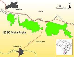 The Mata Preta Ecological Station (ESEC) is in the municipality of Abelardo Luz, Santa Catarina.[1] It has an area of 6,566.50 hectares (16,226.2 acres).[2] The ESEC lies just south of the border with the state of Paraná. It is along the south of the section of the BR-280 highway between Clevelândia and Palmas, in three separate sections. The SC-155 highway divides the eastern section from the central section.[3] The buffer zone is 500 metres (1,600 ft) wide and includes part of the municipality of Clevelândia.[4]