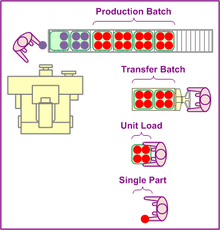 Unit loads can be used both for in-process handling and for distribution (receiving, storing, and shipping). Unit load design involves determining the type, size, weight, and configuration of the load; the equipment and method used to handle the load; and the methods of forming (or building) and breaking down the load. For in-process handling, unit loads should not be larger than the production batch size of parts in process. Large production batches (used to increase the utilization of bottleneck activities) can be split into smaller transfer batches for handling purposes, where each transfer batch contains one or more unit loads, and small unit loads can be combined into a larger transfer batch to allow more efficient transport.[10]