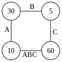 For the example below, there are four sides: A, B, C and the final result ABC. A is a 10×30 matrix, B is a 30×5 matrix, C is a 5×60 matrix, and the final result is a 10×60 matrix. The regular polygon for this example is a 4-gon, i.e. a square: