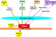 Remote sensing depends on the interaction of a source of energy with a target, and energy measured from the target.[19] In the "Remote Sensing" diagram, Source 1a is an independent natural source such as the Sun. Source 1b is a source, perhaps manmade, that illuminates the target, such as a searchlight or ground radar transmitter. Source 1c is a natural source, such as the heat of the Earth, with which the Target interferes.