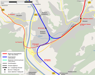 With the opening of the Neckar Valley Railway, Neckarelz station, which was previously located on the southern outskirts, was moved on to the new line and away from the old Odenwald Railway.