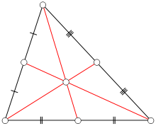 Each median of a triangle passes through the triangle's centroid, which is the center of mass of an infinitely thin object of uniform density coinciding with the triangle.[1] Thus the object would balance on the intersection point of the medians. The centroid is twice as close along any median to the side that the median intersects as it is to the vertex it emanates from.