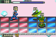 Unlike the previous action-platformer entries of the Mega Man franchise, Mega Man Battle Network is a real-time tactical RPG. To progress through the game the player must alternately navigate the outside world as Lan Hikari and the Net as MegaMan.EXE, each containing certain tasks that must be completed to allow advancement in the other.[11] Controlling Lan, the player may travel around the world map, interact with non-player characters, check email, purchase items, initiate Net missions, or speak with MegaMan.EXE through his PET.[6] In contrast with traditional Mega Man entries in which battle and movement through the levels happen in the same setting, Battle Network's combat occurs only through by battling computer viruses within the Net. This cyber world is represented by a series of branching pathways and nodes, where MegaMan.EXE can travel to both new and previously visited locations, find and purchase items, and fight viruses. Battles do not generally appear on the field screen of the Net but are usually set as random encounters.[12] The battlefield itself is made up of 18 tiles divided into two groups of nine, one group being space in which MegaMan.EXE may freely move and the other group being space inhabited by enemies.[5][6][13] Akin to other Mega Man games, MegaMan.EXE possesses an arm cannon called the "Mega Buster". The player can transition among the nine provided tiles and fire the Mega Buster at enemies from across the screen. The objective of each battle is to delete all the viruses by reducing their hit points (HP) to zero.[6] If MegaMan.EXE's own health depletes, a game over occurs. Certain power-up programs can be found that upgrade MegaMan.EXE's HP, defense, or Mega Buster power.[6][12]