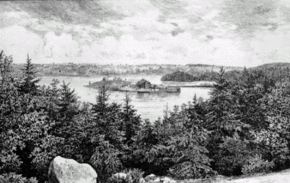 Though the Halifax area was settled by aboriginals, particularly the Mi'kmaq people, as early as 7000 BC,[17] there is no archaeological evidence of native habitation on Melville Island prior to the arrival of the Europeans. The first Europeans to reach the land were likely French traders and missionaries in the 17th century.[4] Halifax was founded by the British in 1749.[18] The first documented use of Melville Island was by Robert Cowie and John Aubony, who obtained a Crown grant in 1752 to allow them to build a storehouse. After Cowie's death in 1781, John Butler Kelly purchased what was then known as Cowie's Island and quickly resold it in 1784 to James Kavanagh, the head of a prosperous family fishery, for £65.[19][20] Kavanagh used the land, known as Kavanagh's Island according to the then-prevalent tradition of place naming, to dry and store fish that he would then sell from his Halifax store.