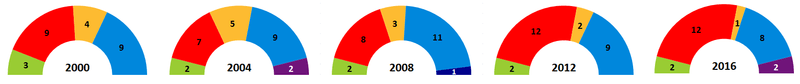 | 2000 | 2004 | 2008 | 2012 | 2016 | ||||||||||||||