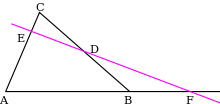 Menelaus' theorem, named for Menelaus of Alexandria, is a proposition about triangles in plane geometry. Given a triangle ABC, and a transversal line that crosses BC, AC and AB at points D, E and F respectively, with D, E, and F distinct from A, B and C, then