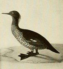 This duck was similar in size to the red-breasted merganser. The adult male had a dark reddish-brown head, crest and neck, with bluish black mantle and tail and slate grey wings. The female was slightly smaller with a shorter crest.