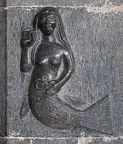 Strictly speaking, the term samguba in the Dindsenchas example signifies "mermaid's melody".[16] However, O'Clery's Glossary explains that this was rhetorically the "name of the nymphs that are in the sea".[17][14] The term suire for "mermaid" also finds instance in the Dinsenchas.[18] Croker also vaguely noted that suire has been used by "romantic historians" in reference to the "sea-nymphs" enounterd by Milesian ships.[4][lower-alpha 5]
