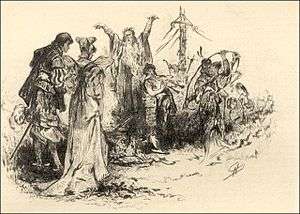 The main street of the village. Indian war drums may be heard, and as the curtain rises Samoset and his braves are seen finishing a war dance. The church is completely gone; other structures are burning. An Indian drags in Love Brewster; she tries to scream, but is scalped. A shot is heard, and Samoset falls, dead. The Indians flee as the Puritans, some wounded, return. Love's grandmother is distraught to see her granddaughter's body, while Tewke and others cry out in biblical lament over the destruction that they see. Bradford appears, and the townsfolk turn to him for prayer and aid. But he is horrified at the realization of his curse, and tells them of his dream, and of his apostasy; he will never again pray. The Puritans lament the loss of their leader. Marigold, distraught and fatigued, appears, her festal dress torn. She recoils from the minister in horror. The Puritans heap abuses on her, calling her a witch and demanding her death. She tells them that she is no witch; happy once, her husband is dead, and she will be happy no more, but must soon join him. The people prepare to stone her, but stop when Bradford tears off his clerical bands and skullcap, revealing the mark of the Devil on his brow. He calls on his new master; flames engulf the village. Marigold swoons in fear, and Bradford seizes her, carrying her in his arms into the fire. In horror, the Puritans kneel in prayer, and the opera closes as they intone the Lord's Prayer.[3]