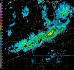 A squall line is an elongated line of severe thunderstorms that can form along and/or ahead of a cold front.[5][6] In the early 20th century, the term was used as a synonym for cold front.[7] The squall line contains heavy precipitation, hail, frequent lightning, strong straight line winds, and possibly tornadoes and waterspouts.[8] Severe weather, in form of strong straight-line winds can be expected in areas where the squall line itself is in the shape of a bow echo, within the portion of the line which bows out the most.[9] Tornadoes can be found along waves within a line echo wave pattern, or LEWP, where mesoscale low pressure areas are present.[10] Some bow echoes which develop within the summer season are known as derechos, and they move quite fast through large sections of territory.[11] On the back edge of the rain shield associated with mature squall lines, a wake low can form, which is a mesoscale low pressure area that forms behind the mesoscale high pressure system normally present under the rain canopy, which are sometimes associated with a heat burst.[12]