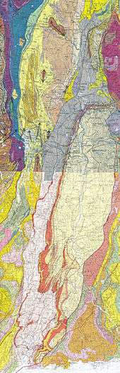 There is no universal consensus on the name for this topographic feature. The Metacomet Ridge is described by some sources as a traprock ridge beginning on the Holyoke Range in Belchertown, Massachusetts, and ending at the Hanging Hills in Meriden, Connecticut.[4] A 2004 report conducted for the National Park Service extends that definition to include the entire traprock ridgeline from Greenfield, Massachusetts, to Long Island Sound.[1] The Sierra Club has referred to the entire range in Connecticut as "The Traprock Ridge".[5] Geologically and visually, the traprock ridgeline exists as one continuous landscape feature from Belchertown, Massachusetts, to Branford, Connecticut at Long Island Sound, a distance of 71 miles (114 km), broken only by the river gorges of the Farmington River in northern Connecticut and the Westfield and Connecticut Rivers in Massachusetts.[1][3] Until January 2008, the United States Board on Geographic Names (USBGN) did not recognize Metacomet Ridge, Traprock Ridge or any other name, although several sub-ranges were identified.[6][7] Geologists usually refer to the overall range generically as "the traprock ridge" or "the traprock mountains" or refer to it with regard to its prehistoric geologic significance in technical terms.[8] Further complicating the matter is the fact that traprock only accounts for the highest surface layers of rock strata on the southern three–fourths of the range; an underlying geology of related sedimentary rock is also a part of the structure of the ridge; in north central Massachusetts it becomes the dominant strata and extends the range geologically from the Holyoke Range another 35 miles (56 km) through Greenfield to nearly the Vermont border.[8][9] This article describes the entire Metacomet Ridge and all geologic extensions of it.