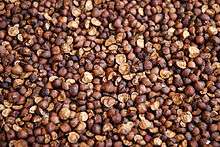 Mexican jumping beans (also known as frijoles saltarines in Spanish) are seed pods that have been inhabited by the larva of a small moth (Cydia deshaisiana) and are native to Mexico. The "bean" is usually tan to brown in color. It "jumps" when heated because the larva spasms in an attempt to roll the seed to a cooler environment to avoid dehydration and consequent death. They are from the shrub Sebastiania pavoniana, often also referred to as "jumping bean". However, they are not related to actual beans (legume plants), but rather to spurges. The beans are considered non-toxic but are not generally eaten.[1]