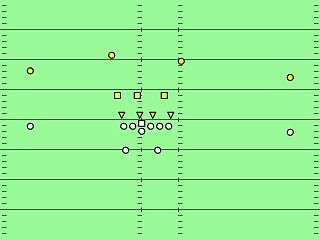 The base Miami front is an "over" front, with a nose tackle shaded weak side to the center, a defensive tackle shaded outside the strong side guard, a defensive end shaded outside the tight end, and the weakside end outside the offensive tackle. Each lineman is assigned one gap. Linebackers are stationed about 4 to 4.5 yards behind the line of scrimmage.[5] This differs from the old Landry 4-3 defenses, in which linebackers are within 1.5 yards of the line of scrimmage.[6]