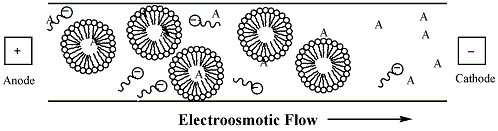 In most applications, MEKC is performed in open capillaries under alkaline conditions to generate a strong electroosmotic flow. Sodium dodecyl sulfate (SDS) is the most commonly used surfactant in MEKC applications. The anionic character of the sulfate groups of SDS cause the surfactant and micelles to have electrophoretic mobility that is counter to the direction of the strong electroosmotic flow. As a result, the surfactant monomers and micelles migrate quite slowly, though their net movement is still toward the cathode.[2] During a MEKC separation, analytes distribute themselves between the hydrophobic interior of the micelle and hydrophilic buffer solution as shown in figure 1.