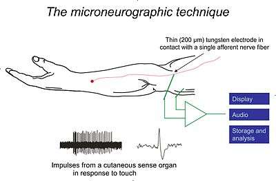 Microneurography is a neurophysiological method employed by scientists to visualize and record the normal traffic of nerve impulses that are conducted in peripheral nerves of waking human subjects. The method has been successfully employed to reveal functional properties of a number of neural systems, e.g. sensory systems related to touch, pain, and muscle sense as well as sympathetic activity controlling the constriction state of blood vessels. To study nerve impulses of an identified neural system, a fine tungsten needle electrode is inserted into the nerve and connected to a high gain recording amplifier. The exact position of the electrode tip within the nerve is then adjusted in minute steps until the electrode discriminates impulses of the neural system of interest. A unique feature and a significant strength of the microneurography method is that subjects are fully awake and able to cooperate in tests requiring mental attention, while impulses in a representative nerve fibre or set of nerve fibres are recorded, e.g. when cutaneous sense organs are stimulated or subjects perform voluntary precision movements.