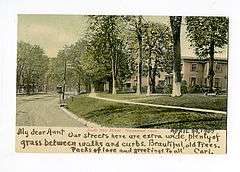 From a 1907 postcard: "Our streets here are extra wide, plenty of grass between walks and curbs. Beautiful old trees. Packs of love and greetings to all, Carl" | |