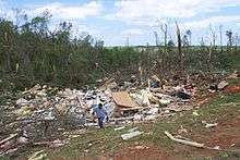 Tornado was a quarter-mile wide. 300 homes and 38 other buildings were damaged, with 25 structures and three businesses destroyed. A middle school building suffered extensive damage and was closed for nearly a week for repairs. A nearby high school was also damaged. Approximately 1000 trees were downed by the tornado and over 300 vehicles were damaged.[5] | |