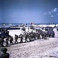 The military history of Canada during the Second World War[1] begins with the German invasion of Poland on 1 September 1939. While Canadian forces were eventually active in nearly every theatre of war, most combat was centred in Italy,[2] Northwestern Europe,[3] and the North Atlantic. Over the course of the war, more than 1.1 million Canadians served in the Canadian Army, Royal Canadian Navy, Royal Canadian Air Force, and in forces across the Commonwealth. More than 44,000 lost their lives[4] and 54,000 were wounded.[5] The financial cost was $21.8 billion between 1939 and 1950.[6] By the end of the war Canada had the world's fourth largest air force,[7] and fifth largest navy[8] The Canadian Merchant Navy completed over 25,000 voyages across the Atlantic,[9] 130,000 Allied pilots were trained in Canada in the British Commonwealth Air Training Plan. On D-Day, 6 June 1944 the 3rd Canadian Infantry Division landed on "Juno" beach in Normandy, in conjunction with allied forces. The Second World War had significant cultural, political and economic effects on Canada, including the conscription crisis in 1944 which affected unity between francophones and anglophones. The war effort strengthened the Canadian economy and furthered Canada's global position.[10]