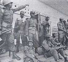 In late 1975, Mobutu, in a bid to install a pro-Kinshasa government in Angola and thwart the Marxist Popular Movement for the Liberation of Angola (MPLA)'s drive for power, deployed FAZ armored cars, paratroopers, and three infantry battalions to Angola in support of the National Liberation Front of Angola (FNLA).[33] On 10 November 1975, an anti-Communist force made up of 1,500 FNLA fighters, 100 Portuguese Angolan soldiers, and two FAZ battalions passed near the city of Quifangondo, only 30 kilometres (19 mi) north of Luanda, at dawn on 10 November. The force, supported by South African aircraft and three 140 mm artillery pieces,[34] marched in a single line along the Bengo River to face an 800-strong Cuban force across the river. Thus the Battle of Quifangondo began. The Cubans and MPLA fighters bombarded the FNLA with mortar and 122 mm rockets, destroying most of the FNLA's armored cars and six Jeeps carrying antitank rockets in the first hour of fighting.[35]