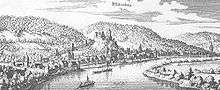 Miltenberg belonged from its founding in the 13th century until the Old Empire’s downfall in 1803 to Electoral Mainz which is the origin of the Wheel of Mainz. The M first appeared in a seal from the early 16th century that also included Saint Martin, as had earlier seals. The current arms are based on those that were once seen on the now vanished Schindtor, a town gate.[6]