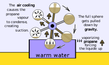 The Minto wheel is a heat engine named after Wally Minto. The engine consists of a set of sealed chambers arranged in a circle, with each chamber connected to the chamber opposite it. One chamber in each connected pair is filled with a liquid with a low boiling point (propane (TB = −42 °C) and R-12 (TB = −29.8 °C) are listed in the Mother Earth News articles). Ideally, the working fluid also has a high Vapor pressure and density.