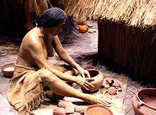 The potters used slab-built construction and the "coiling" method,[3][4] which involved working the clay into a long string which was wound round to form a shape and then modeled to form smooth walls, as the potter's wheel was not used by pre-contact Native Americans. Some decoration of the clay was done at this stage by incising, defenstrating, adding shapes, or stamping designs into the wet clay. After the works had dried sufficiently, it was heated in a wood fire.