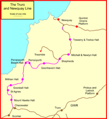 The Truro and Newquay Railway was a Great Western Railway line in Cornwall, United Kingdom designed to keep the rival London and South Western Railway (LSWR) out of the west of the county.[1] The line was completed in 1905 and closed in 1963.