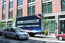 A mobile billboard is a device used for advertising on the side of a truck or trailer that is typically mobile. Mobile billboards are a form of out-of-home advertising (OOH); radio, static billboards, and mall/airport advertising fall into this same category. Using a mobile billboard for advertising is an advertising niche called mobile outdoor advertising.