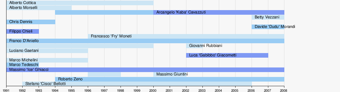 | Members | Arcangelo "Kaba" Cavazzuti · Elisabetta "Betty" Vezzani · Davide "Dudu" Morandi · Francesco "Fry" Moneti · Franco D'Aniello · Massimo "Ice" Ghiacci · Roberto Zeno |