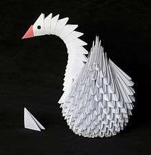 Modular origami or unit origami is a paperfolding technique which uses two or more sheets of paper to create a larger and more complex structure than would not be possible using single-piece origami techniques. Each individual sheet of paper is folded into a module, or unit, and then modules are assembled into an integrated flat shape or three-dimensional structure by inserting flaps into pockets created by the folding process. These insertions create tension or friction that holds the model together.
