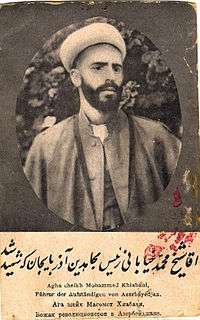 Shaikh Mohammad Khiābāni (Persian: شیخ محمد خیابانی, 1880–1920), sometimes spelled Khiyabani, also known as Shaikh Mohammad Khiābāni Tabrizi was an Iranian Azerbaijani cleric, political leader, and representative to the parliament.